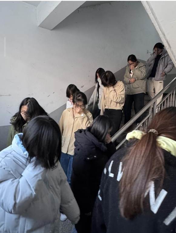 以练为战筑防线 防患未“燃”护平安。活动主持人向学生普及宿舍火灾常见诱因、初期火灾扑救方法、火场逃生技巧等核心知识。为让知识真正落地,模拟“火情”突发,学生们在工作人员的引导下,用手捂住口鼻,弯腰低姿沿宿舍的安全通道快速撤离,全程不推挤、不慌张,从容有序地向指定的篮球场空旷区域集结。